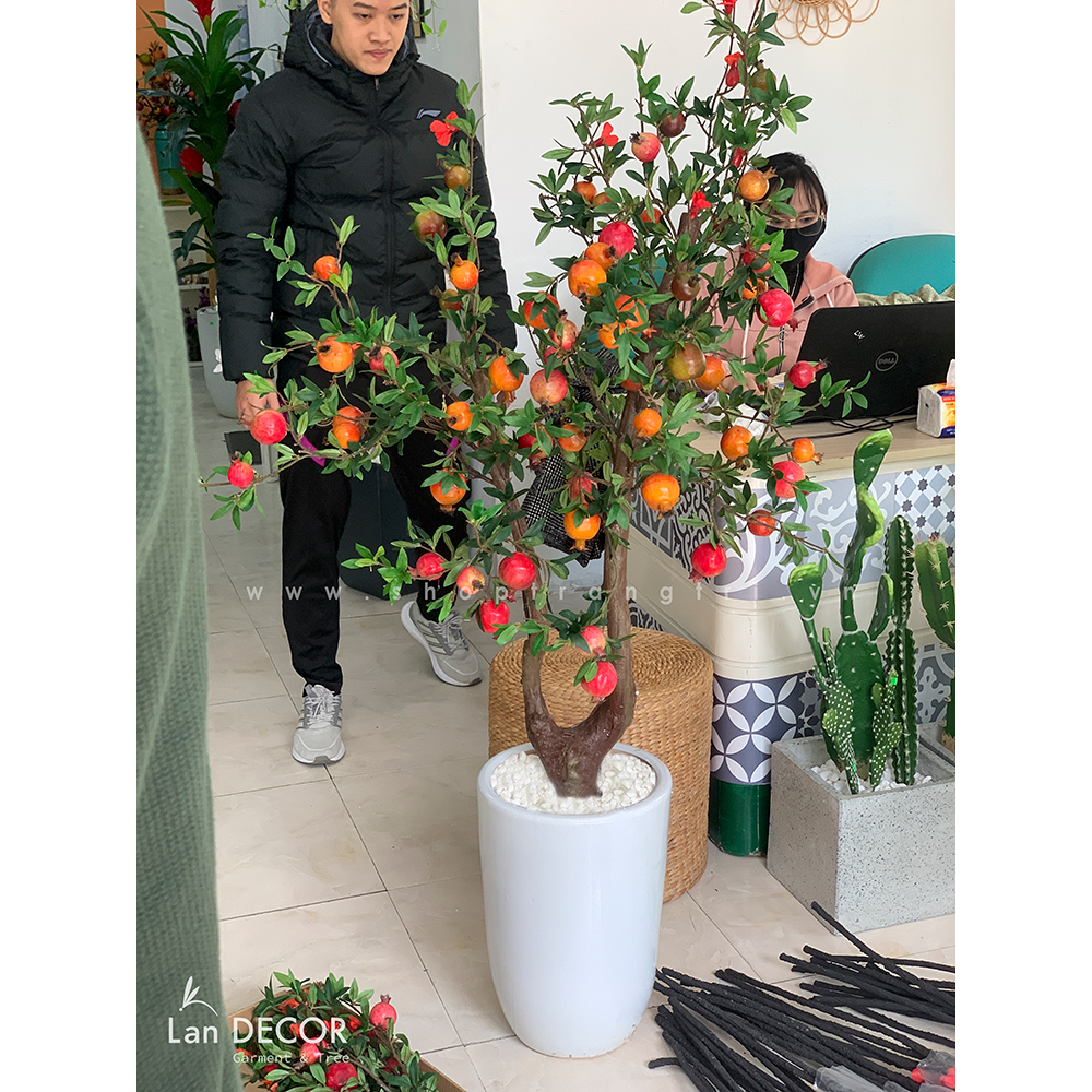 - Cây lựu giả với quả đỏ nổi bật trên nền lá xanh tự nhiên mang ý nghĩa của sự trẻ trung, giàu sức sống, đồng thời mang ý nghĩa phong thủy tốt.