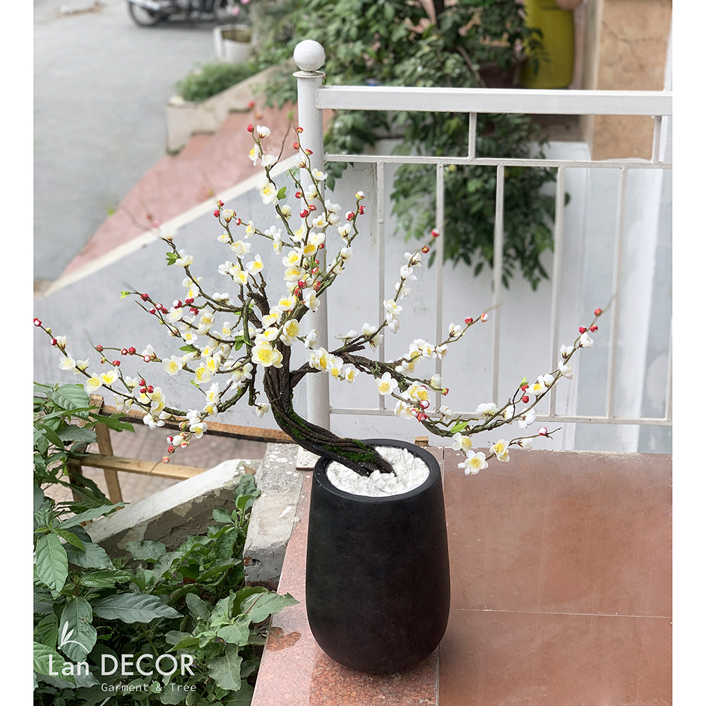 - Sản phẩm gồm chậu trang trí và cành hoa mận trắng