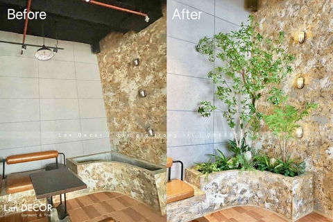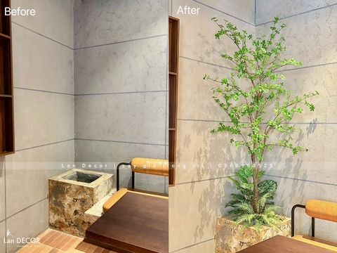 Không gian quán trước và sau khi thi công thiết kế bồn cây tiểu cảnh