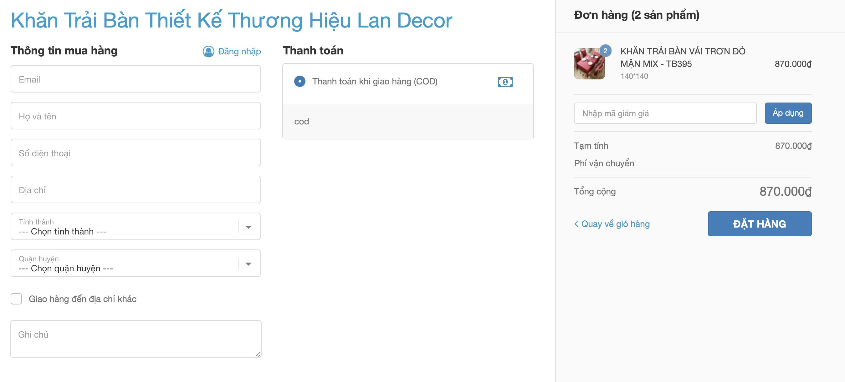Chào mừng quý khách hàng đến với Lan DÉCOR, chúng tôi chuyên cung cấp các sản phẩm về khăn trải bàn, phủ tủ, đệm ghế, rèm cửa cao cấp mang đến cho quý khách hàng những sản phẩm ưng ý nhất. Sau đây chúng tôi xin gửi đến quý khách hàng cách thức mua hàng tại Lan DÉCOR: