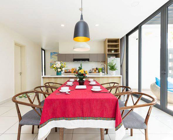 Khăn trải bàn đỏ mix thổ cẩm nổi bật trong không gian
