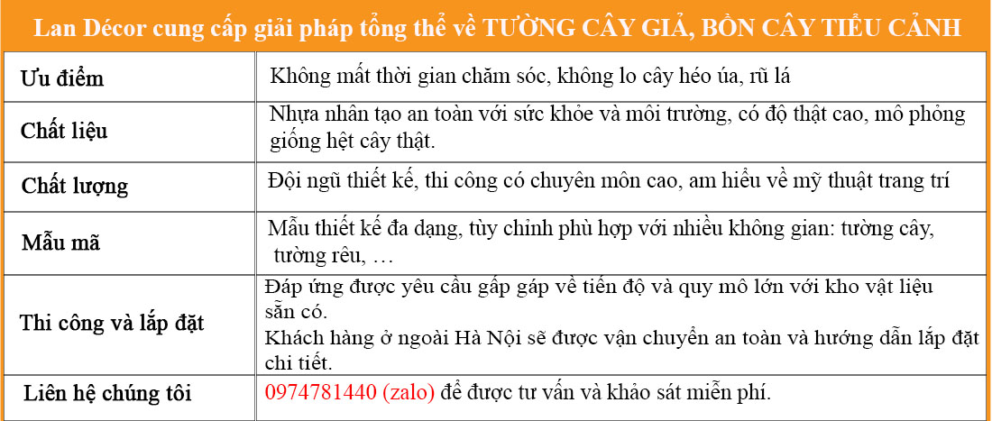 Tìm hiểu thêm về các công trình thi công tường cây, bồn cây tiểu cảnh của Lan Decor: https://shoptrangtri.vn/tuong-cay-tuong-co